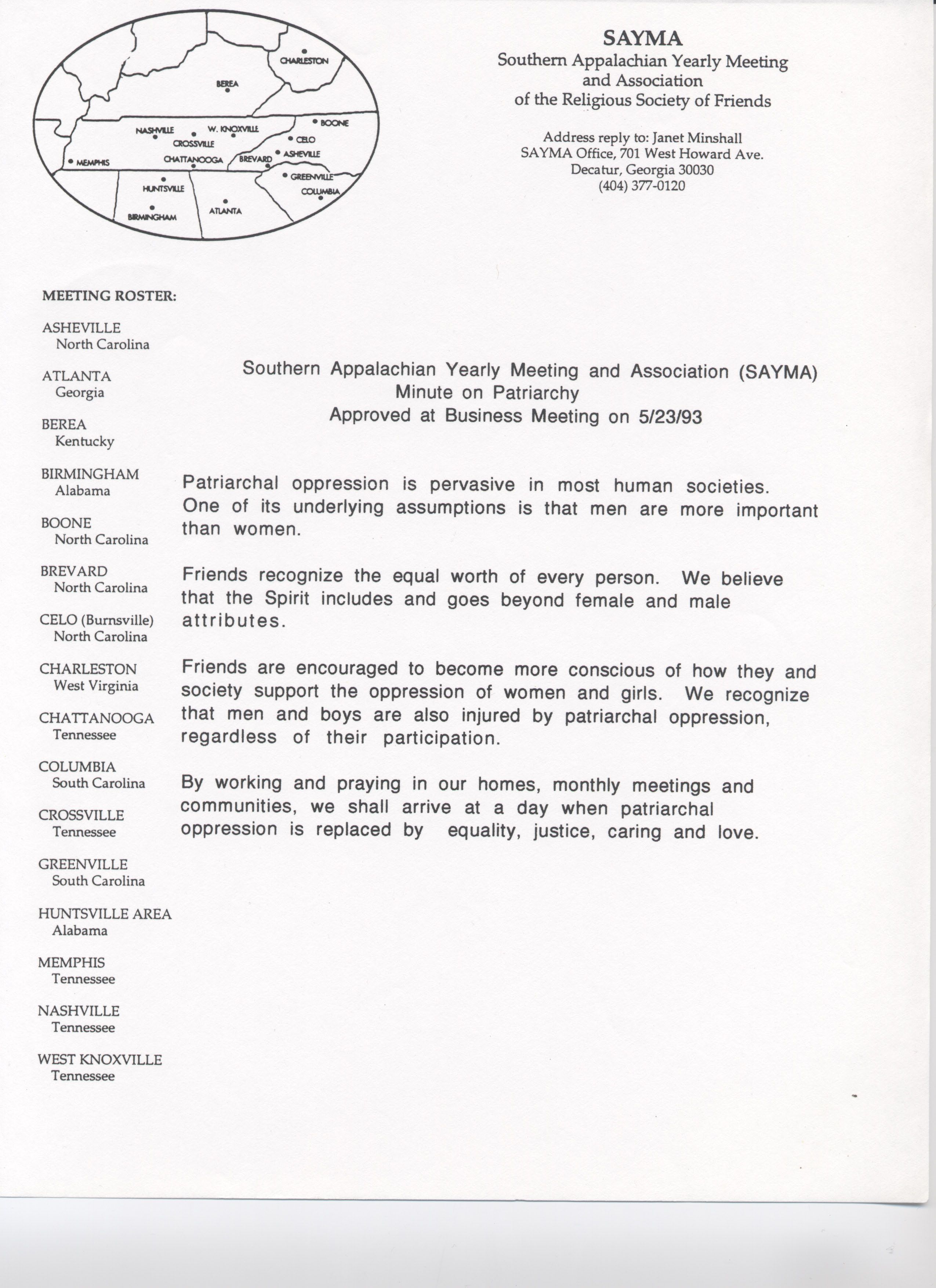 The Meeting acknowledges the certificate signed by the couple and those present at the ceremony as the witness of Friends to the couple's spiritual union. Mindful that only the heterosexual couples among us have the right to legally sanctioned marriage and its privileges, the Meeting asks Friends, and particularly couples preparing for marriage, to examine how best to respond and bear witness to the inequalities still present in the legal system. - April 1986: A Minute on Patriarchy was approved, calling for the replacement of patriarchal oppression with full equality for all humanity. "We acknowledge and believe that we as Quakers must identify, examine and eliminate patriarchical behavior which resides in ourselves. We will work in our homes, our monthly meetings and our communities to arrive at a new day when patriarchal oppression has been replaced by full equality for all humanity."