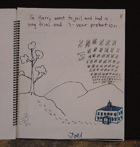 So Harry went to jail and had a long trial and 3-year probation. (Artist: Joel)