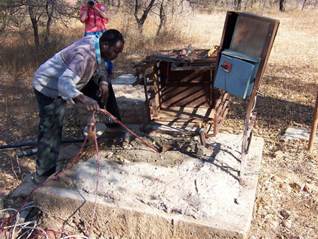 Latest news : Borehole pumps stolenMathe looks down the borehole in disbelief at the submersible pump theft after it having replaced the another pump stolen two weeks previously (May 05)