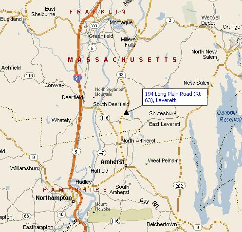 We are at 194 Long Plain Road (Route 63) in Leverett MA 01054, but the street number is not very helpful - if you watch closely however you can spot the "194" on our mailbox on the east side of Route 63. There is a white sign announcing the Meetinghouse, near the driveway entrance.