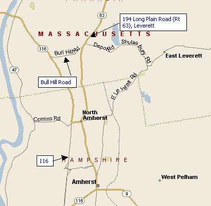 From the north and west: cross the Connecticut River on the Blue Bridge in Sunderland and continue on Route 116 about 2.4 miles from the bridge, where Bull Hill Road goes uphill to the left. Take Bull Hill Road to its end at Route 63. Turn left there, pass by Depot Road on the right, and watch for the Meetinghouse on the left 1/3 of a mile beyond.