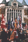 In Quebec City, the crowd filed out of the station, carrying the flags of all ten provinces as well as hundreds of Canadian and Quebec flags. When we marched up the hill from lower town to the old city, I was surprised to the see Guy Bertrand, the separatist-turned-federalist, address the crowd. Bertrand, who had taken the Qu�bec government to court to try to prevent them from ever holding another referendum, is seen by many in Qu�bec as a vengeful person. The reaction of people on the streets of Quebec City was polite. There were no incidents. A few people smiled, but most just looked astonished at this throng carrying Canadian flags as well as those of Qu�bec. In Qu�bec City, you can usually count the Canadian flags on the fingers of two hands.