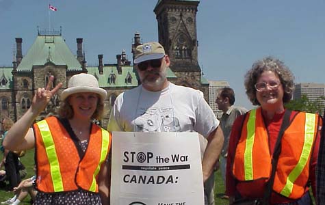 On the Laurier Avenue bridge where the rally ended, Peggy Land of Ottawa Meeting led a Serbian children's chorus in "Give Peace a Chance", chanting words she and a colleague wrote as rap lyrics in between. A dozen marshalls, most of them Friends, succeeded in keeping the crowd moving and to narrowly avoided the escalation of a confrontation outside the U.S. embassy.