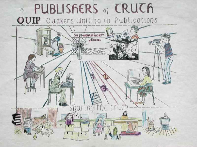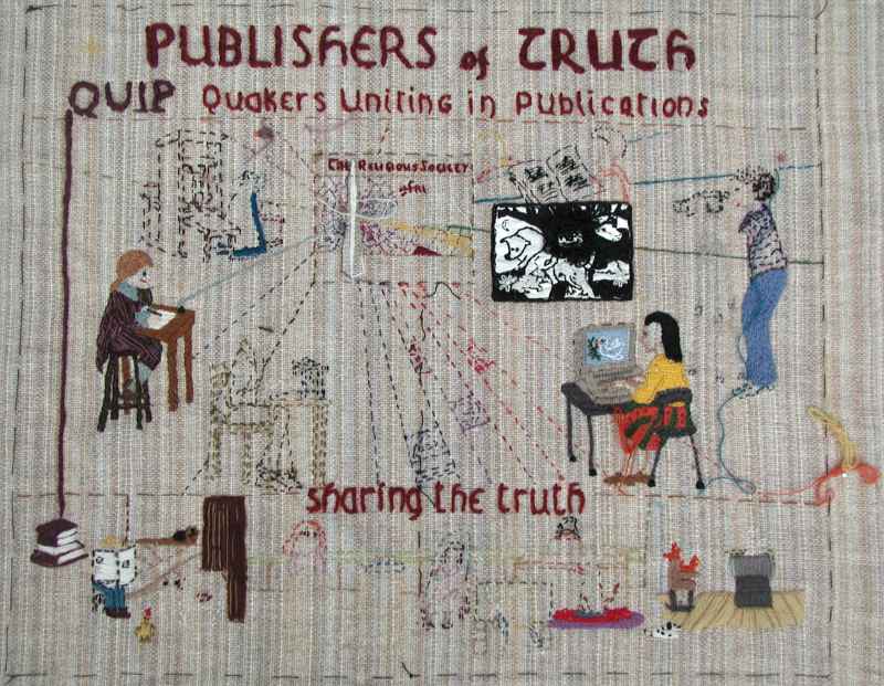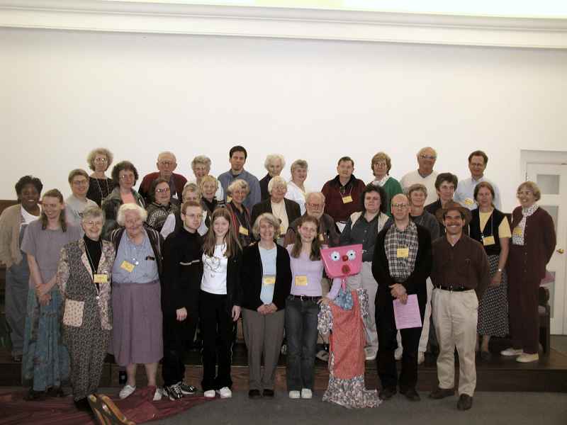 Nearly 40 members of QUIP met at Glenagape Centre, near Greensboro, North Carolina. April 25-28th 2002. In addition to the business sessions there were two panels discussions, a bookfair, and a puppet show. Work continued on the QUIP panel of the Quaker Tapestry.