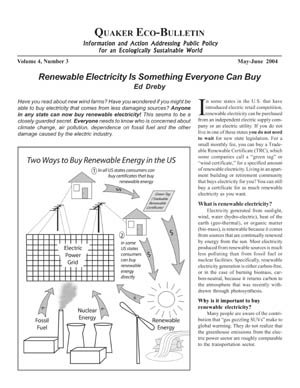 Quaker Eco-Bulletin (QEB)A production of the National Legislation Committee of Quaker Earthcare Witness, QEB is an insert in BeFriending Creation, which comes out bi-monthly, and is included in the Quaker Earthcare Witness website.The masthead says: "Information and Action Addressing Public Policy for an Ecologically Sustainable World" |