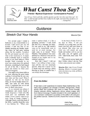 What Canst Thou Say? (WCTS) is a worship-sharing group in print for Quakers with an interest in mystical experience and contemplative practice. WCTS is produced cooperatively by a group of Friends who, themselves, have felt the movement of the Spirit and who wish to deepen their understanding by interacting with others.