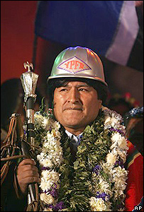 Adorned in power symbols of Andean culture and politics, Evo Morales announced his candidacy for President of Bolivia on Columbus Day, 2005.
