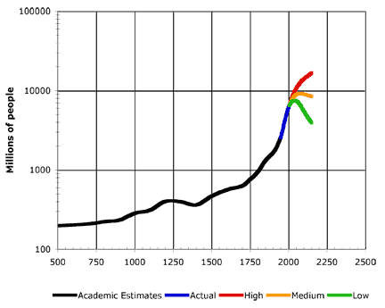 On the right you can see the complete graph [1], showing world population from the year 500 CE, when it was just 200 million people, through the present and then beyond, in three demographic projections made by the United Nations going out to the year 2150. The line segments colored in green, orange, and red depict the "low", "high", and "medium" projections of the United Nations, respectively. [2] Observe how comparatively short a stretch is based on reliable census data (the blue line segment). During this interval, from 1950 to 2005, the rate of population growth is thought to have been higher than at any time in the entire history of homo sapiens. The black line segment shows my calculations of mean historical estimates, interpolated and smoothed. The overall uncertainty in these values is only about three or four times the width of the line segment (more in earlier years, less in the recent past). If you mask the future projections and look only look at the past 1500 years, then it becomes perfectly clear why many have viewed the population explosion with great alarm. In the context of a world with finite surface area and finite resources, any reasonable person observing this history of accelerating growth would expect global society to crash and burn in a spectacular Malthusian catastrophe.