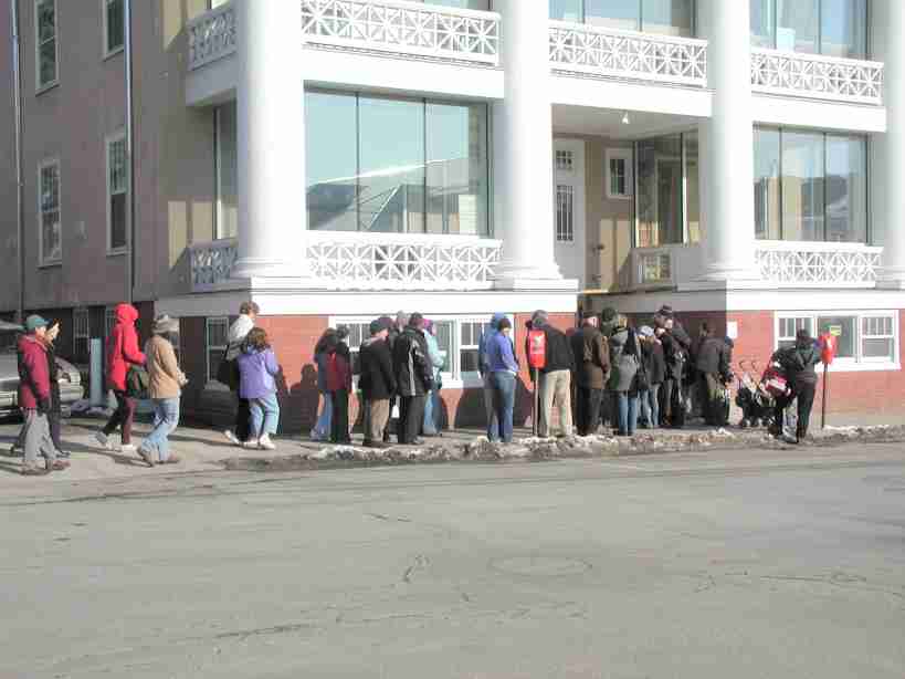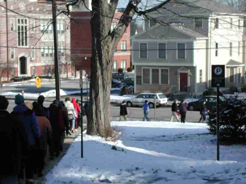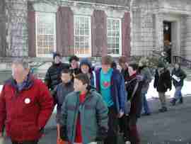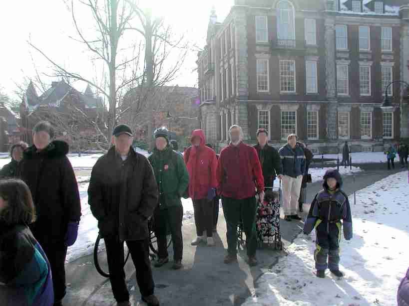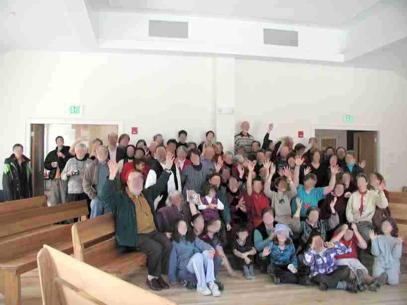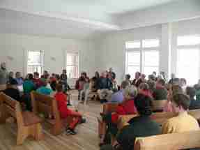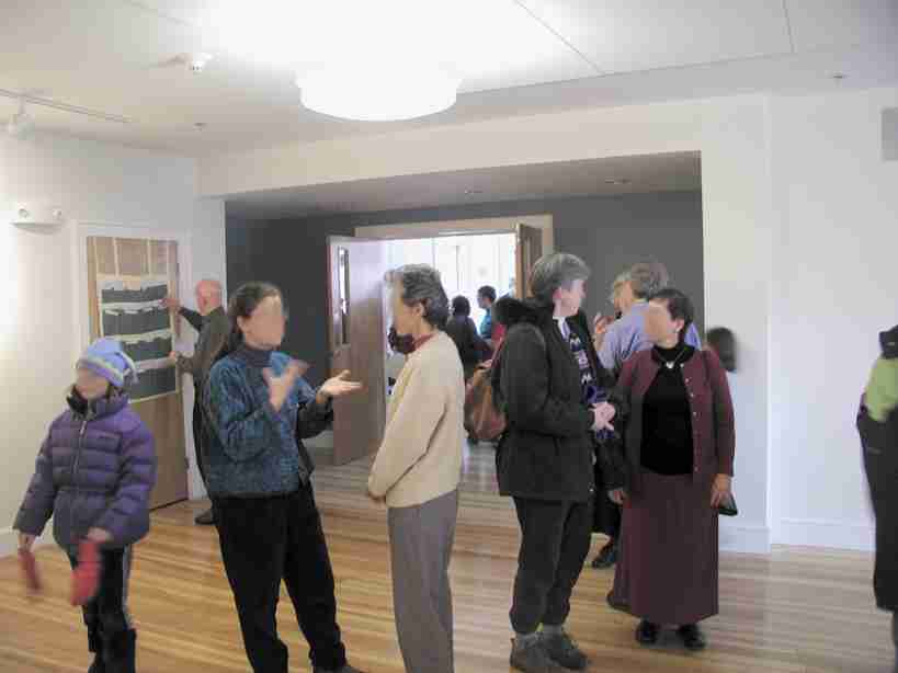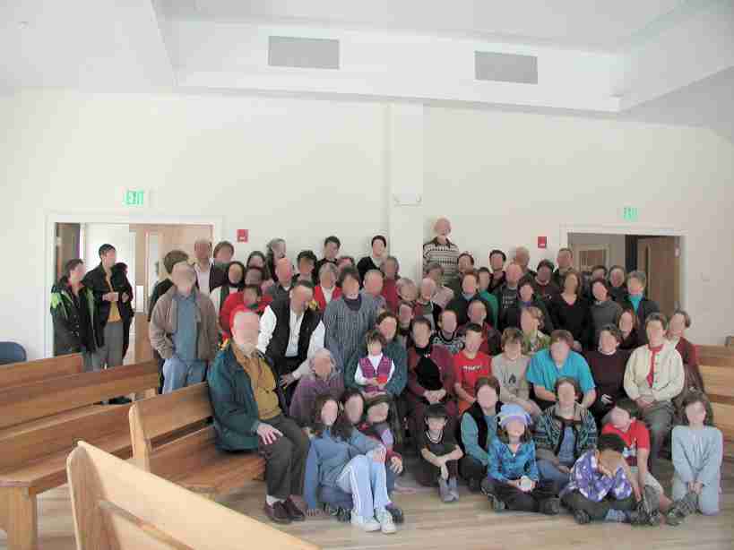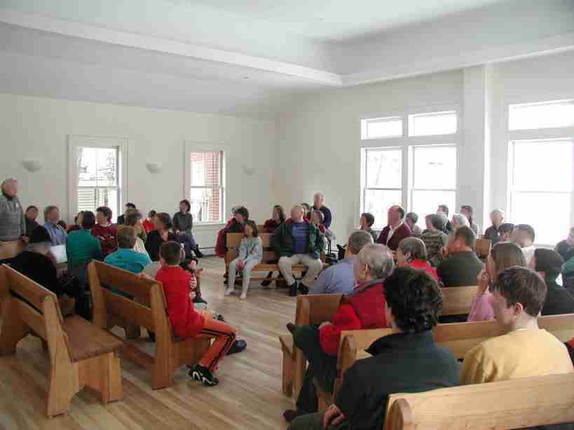 On December 8, 2002, Northampton Friends Meeting held Meeting For Worship for Business in Bass Hall and then gathered there for worship for the last time. After gathering, the Clerk led us across campus to the new meetinghouse at 43 Center Street, where we joyously continued our worship with all the seating occupied, some 65 people. Following worship and introductions, a group photograph was taken.