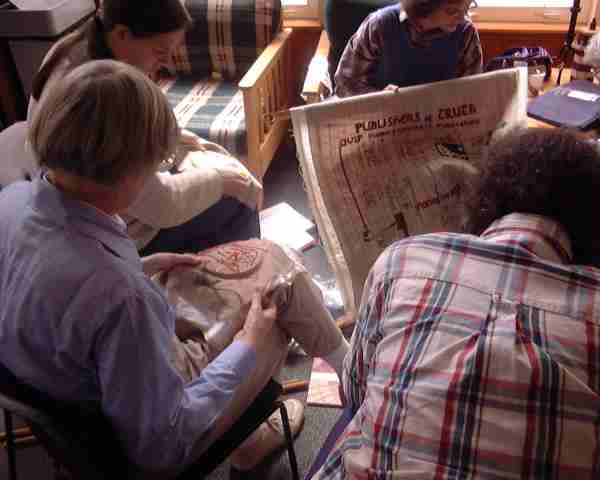 Some Friends received instructions on the stitches used in the QUIP panel for the Quaker Tapestry, which is beginning to take shape.