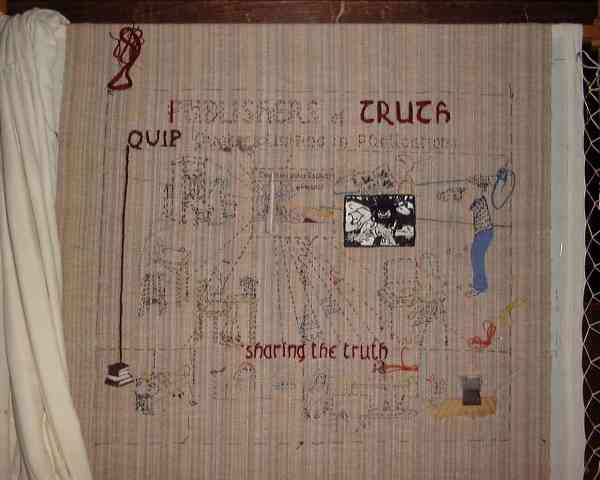 QUIP Panel of North American Quaker Tapestry: Ruth Gallantino, artist for the design of the QUIP panel of the North American Quaker Tapestry, presented us with background information on the design. The partially completed panel was on display. We need people to help with its completion.